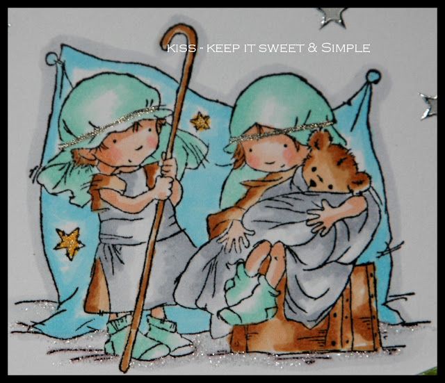 Lili of the Valley - Glitter and Glitz. I added glitter around the edges of the red card, and at the feet of Mary & Joseph. Their head bands are drawn with a Glitter Sakura pen.